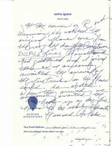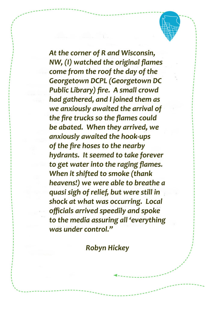 At the corner of R and Wisconsin, NW, (I) watched the original flames come from the roof the day of the Georgetown DCPL (Georgetown DC Public Library) fire. A small crowd had gathered, and I joined them as we anxiously awaited the arrival of the fire trucks…